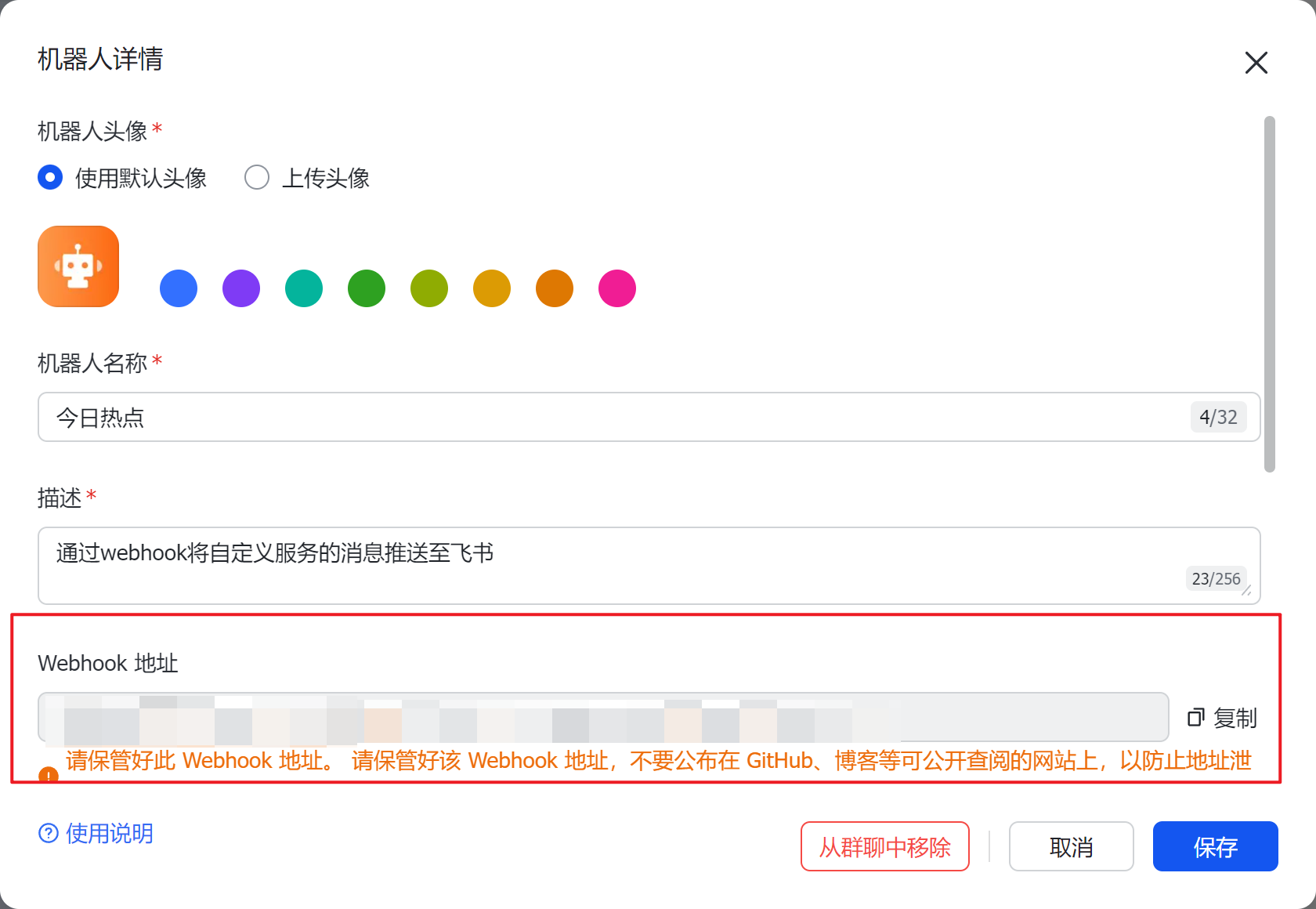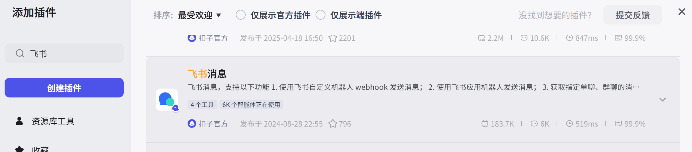 Coze 中的飞书推送插件,需要通过机器人的webhook连接进行推送。