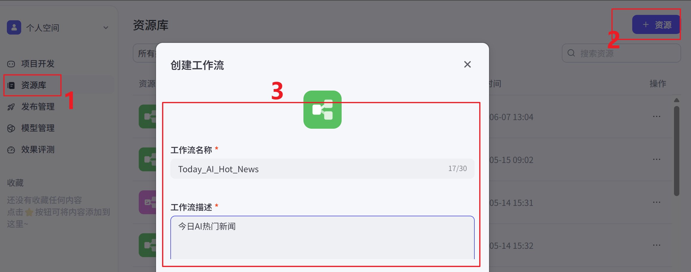 Coze个人空间 -> 资源库 -> +资源 -> 创建工作流