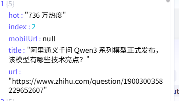 代码逻辑很简单:从热榜数组中获取数据,拼接热点、标题和URL。处理的数据结构为: