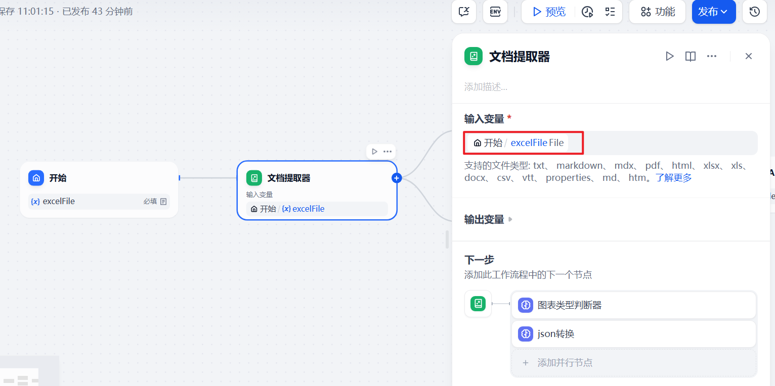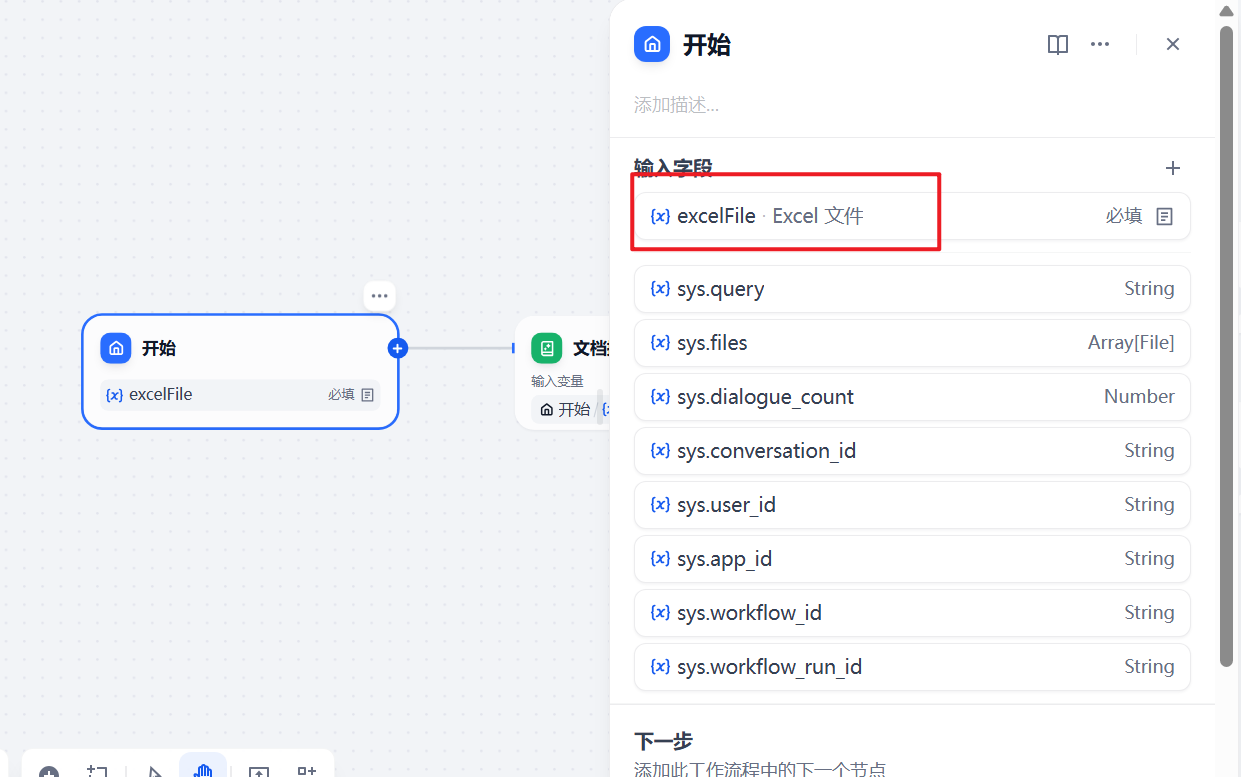 文档提取器,用来接收,从“开始节点” 传递过来的用户上传的 Excel 文件。