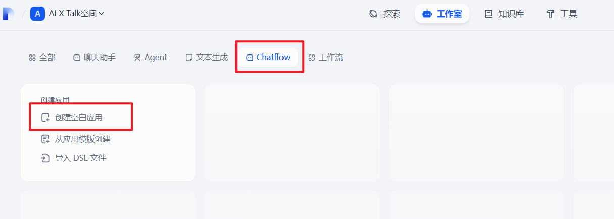 选择应用类型为:ChatFlow,然后点击【创建空白应用】。